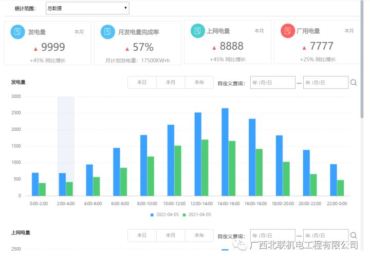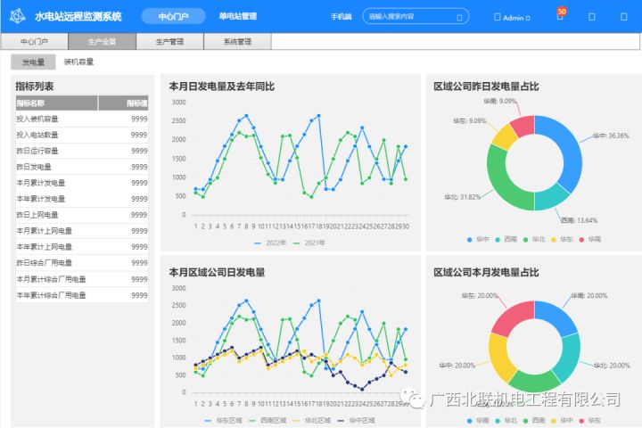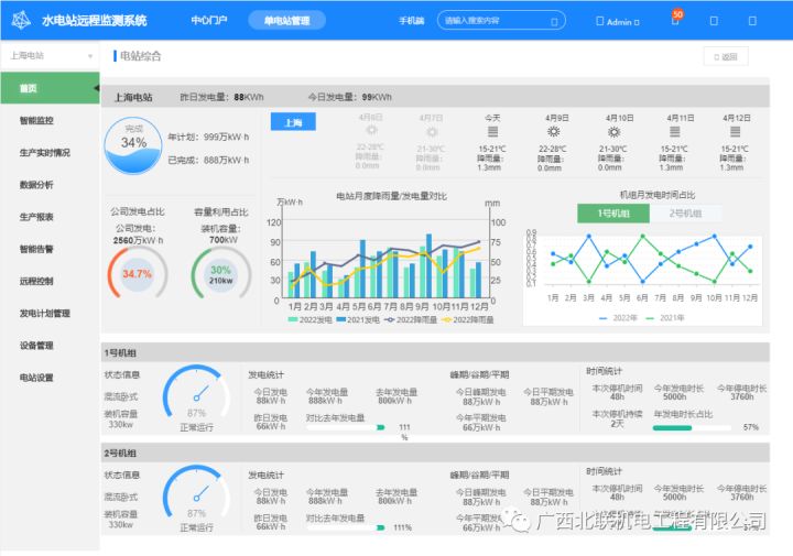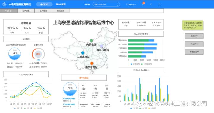 水電站分布位置、總發(fā)電量、計劃發(fā)電完成率、電站發(fā)電排名情況、電量對比等。